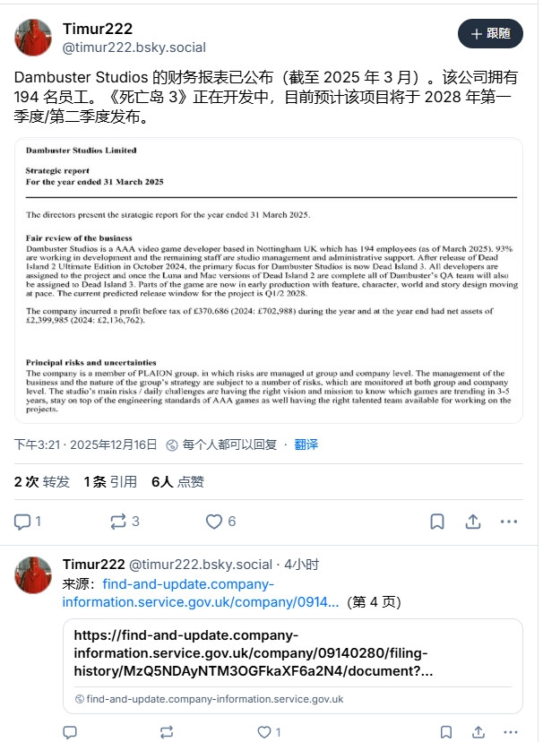 大约几个月前,《死亡岛2》的开发商Dambuster Studios与发行商Deep Silver已基本确认《死亡岛3》的存在。近期,数据挖掘人员Timur222通过分析Dambuster的财务报表发现,这家英国工作室计划于2028年第一季度或第二季度推出《死亡岛3》。