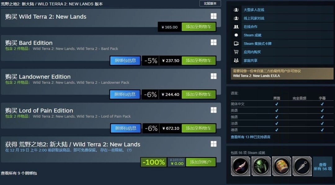 沉浸式中世纪题材大型多人在线角色扮演游戏《荒野之地2:新大陆》,将于12月19日凌晨2点前在Steam平台推出限时免费领取活动,活动期间玩家可将该游戏永久收入个人游戏库中。