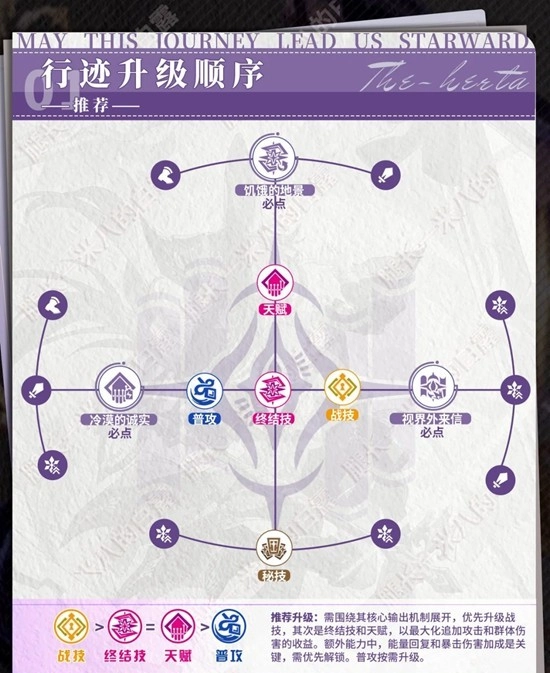 推荐升级建议如下:应围绕角色的核心输出机制来规划,升级优先级上战技需排在首位,之后再考虑终结技与天赋的提升,这样能让追加攻击和群体伤害的收益达到最大化。在额外能力方面,能量回复和暴击伤害加成是重点,要优先解锁这两项。至于普攻,则可以根据实际需求来决定是否升级。