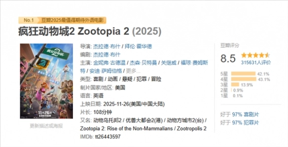 在口碑表现上,《疯狂动物城2》于豆瓣平台的评分从开分时的8.7分小幅下滑至8.5分,目前已有超31万用户参与评价。从评分构成来看,42.1%的观众给出5星评价,43.1%的观众给出4星,另有13.9%的观众给出3星。