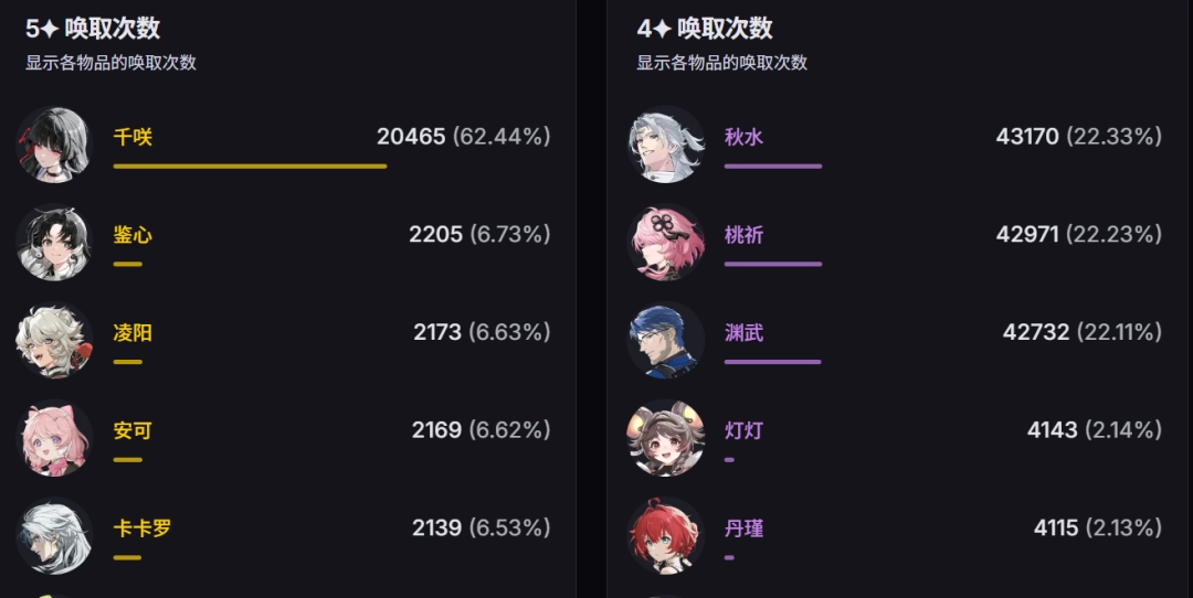 本期千咲的抽取数据总算公布了,截至当前统计时段,千咲的出货量已超两万,而菲比仅一千四百多个,两者比例差距确实不小。不过这也不难理解——毕竟千咲是未来效应类辅助,属于潜力股;菲比和赞妮的光噪效应没法吃到千咲的效应增伤,很多抽菲比的玩家其实是为了补强赞妮,所以这期的抽取数据多少有点出人意料。五星角色里歪得最多的是鉴心,其次是凌阳,但看昨天的评论区,歪到凌阳的玩家似乎更多。话说回来,抽卡歪角色的各位都歪到了哪一位?欢迎在评论区一起聊聊~