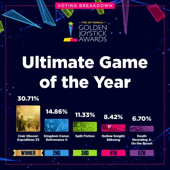此外,依据官方发布的数据,在“终极年度最佳游戏大奖”评选中,《光与影:33号远征队》的得票率达到了30.71%的高比例,比第二名《天国:拯救2》的得票率还要多出一倍有余!