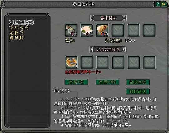 大侠可以通过参加副本挑战、运镖护送等游戏玩法来收集各类食材,进而合成出鲫鱼豆腐汤、滋补鸡汤、老鸭汤和腌笃鲜这四种不同的汤品。饮用这些汤品后,就能获得经验值、授业点数、装备碎片以及兵魄洗炼石等优质道具!