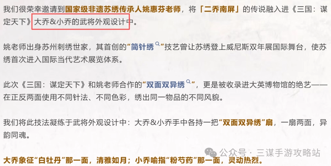 11月28日,三谋将与非遗苏绣展开联动,为大乔和小乔设计一套全新皮肤。