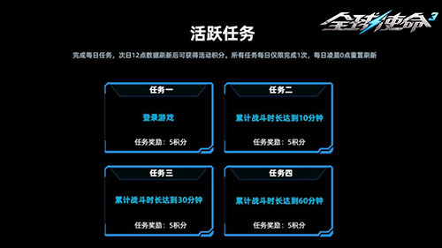 活动期间,玩家将参与一系列兼具挑战性与惊喜感的活跃任务。任务共4项,涵盖每日登录、累计战斗时长分别达到10分钟、30分钟、60分钟等不同要求。玩家每日完成对应任务后,每项任务会在次日12点发放5积分。所有任务每日仅能完成1次,因此玩家每日最多可获得25积分。任务会在每日凌晨0点准时重置。玩家在体验战斗乐趣的过程中,可逐步积累积分,以便为后续兑换丰厚奖励提前准备。