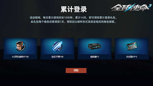 活动期间,玩家每日累计游戏时长达到10分钟,且累计满14天,就能领取超值的累计登录礼包。礼包内含20个G1突击者碎片——这是合成幻影-G1突击者(优秀)的关键材料,集齐10个即可合成,同时也是幻影后续升星的珍稀必备材料;20个钻石子弹,能在战斗中为武器提供强劲火力加成;3个搞机箱,可开启获取各类珍贵道具;3个ID识别卡,用于解锁特殊身份或功能。这些奖励在游戏里都有着重要作用,帮助玩家在战场上更能应对自如。