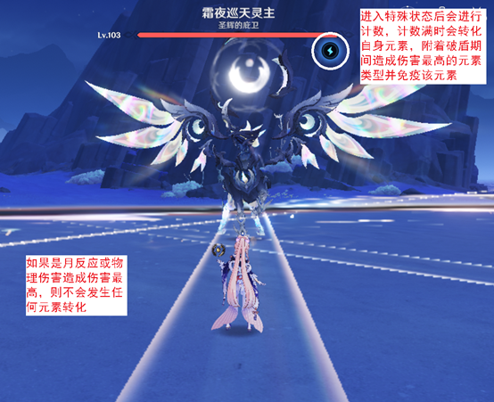 不过这个机制是能够规避的——要是对冰马造成最高伤害的是月反应伤害或者物理伤害,那它就不会触发该机制。另外,用月反应攻击冰马的时候,伤害计数会乘以6,也就是说每攻击一次,效果等同于其他角色攻击6次,破盾的效率非常高。