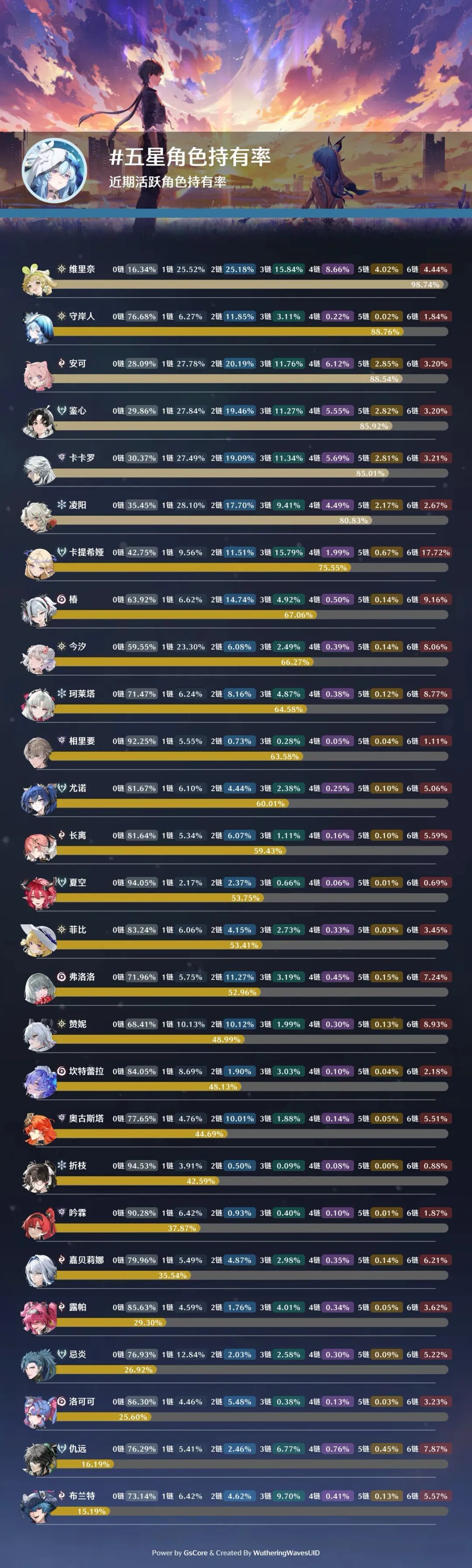 ✦最新的全角色持有率数据出炉啦,仇远在未复刻的情况下持有率反超了船长。除了赠送的香料和常驻角色外,鸣潮里男角色的持有率确实偏低,各位漂泊者们,你们的江湖梦可不能只停留在嘴上呀!