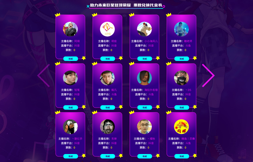 本次“梦想之星”主播榜单集结了抖音、斗鱼、B站三大主流直播平台的众多潜力主播,阵容丰富多元且亮点十足。作为主播主力阵营的抖音平台,有张三、天梦哥哥、明俊、老非(街球老非)、小艾、晚秋、海老师、丶劉亿手、小小海风儿、阿湿、丶楪秋、破别、达己、这是杨小鱼o、破军Sg、胖哥哥、隔壁老王、阿靖、铅笔、东岸等多位主播参与其中,覆盖不同风格与领域,有望在活动里呈现多样的直播魅力;斗鱼平台也毫不逊色,糖老师、毅凡、罗卡还是一姐、海拉尔名宿、白猫哥酷爱打球、北城小凡凡、帝曲、韓逸丨灵儛等主播实力加入,他们将依托各自的特色内容争夺榜单席位;B站方面,猫儿的忧伤、璓丶、悠悠、帅气的王帅傅、阿赢等主播同样准备就绪,力求在这场竞争中崭露头角,为平台增添光彩。当前,所有主播的票数暂时还未开始增长,处于同一起跑线,后续的竞争局势备受关注。