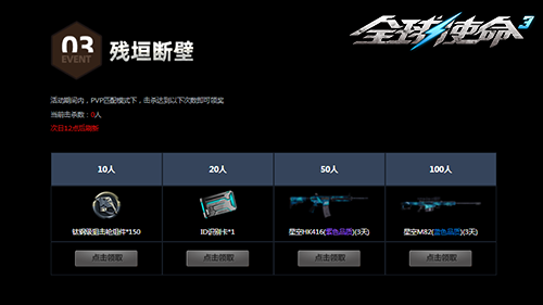 想在人群中展现你精湛的射击本领吗?那就来PVP模式,和其他玩家来一场互动竞技的对决吧!在这个模式里,玩家累计击杀敌人达到规定数量,就能领取我们准备的大量丰厚奖励。累计杀敌满300人的玩家,可获得武器星空M82(3天)。带有星空图案的M82,是一款50BMG口径的反器材狙击步枪,弹匣容量为5发。它的主要特点是威力大、后坐力高,并且可以连射。在残垣断壁之间,枪林弹雨之中,谁能成为强者?所有奖励都会通过邮件发送给玩家,请记得及时查收。