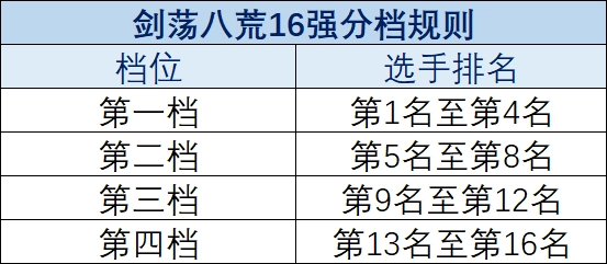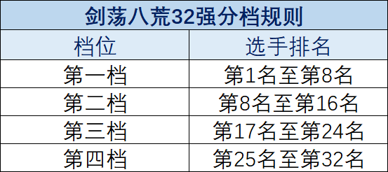 (3)在32强比赛结束后,进入剑荡八荒决赛16强的少侠将根据复赛成绩进行排名,排名后将分为4档,分档规则如下: