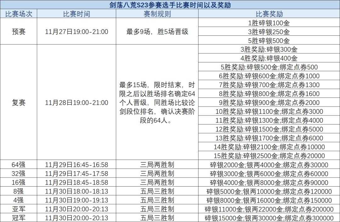 1、剑荡八荒S23赛季即将拉开帷幕,参与赛事即可赢取碎银、银两、绑定点券等丰厚奖励,玩家观看赛事并参与竞猜,还能获得海量荡剑币,各位侠士请提前做好准备(温馨提示:仅处于主门派状态的少侠可参与剑荡八荒相关赛事):