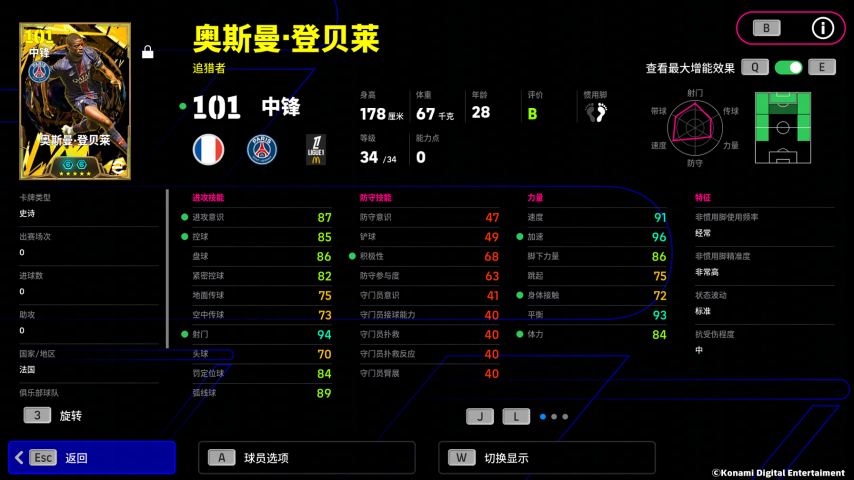 登贝莱的增能属性是【防守铁人 +3】,这位新晋“金球先生”可不只进攻厉害,他全力奔跑的积极表现,能不断对对方的持球队员形成施压!