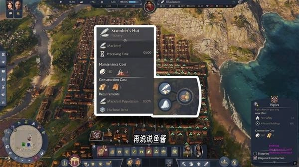 说完面包,再说说鱼露,它需要鲭鱼,而这是一种特产,看左下角,我的初始岛屿没有鲭鱼资源,所以只好出海寻找新岛屿。这座岛有鲭鱼,就它了!新岛屿的港口,倒是不需要建筑材料只要钱就行。和1800一样,这里也需要建造房子,不然没有劳动力。