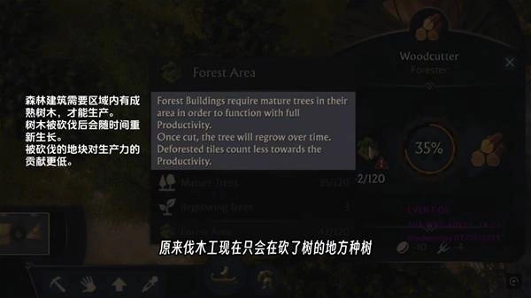 仔细查看说明后发现,原来伐木工现在只会在砍了树的地方种树,如果一开始没有树,那就不行。我也试了一下,用拆除功能不能砍树了,并且,原先建造在树林上的建筑,拆除后,树林也会重新长出来。后面我才找到了植树的办法,在后面的另一个系统里。把伐木小屋都搬迁到树林里,这才解决了木材问题。然后就要开始着手处理需求了。