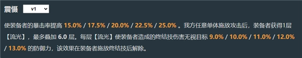 让装备者的暴击率提升15.0%、17.5%、20.0%、22.5%、25.0%。当我方任意单体进行攻击释放后,装备者会获取1层[流光] ,最多可叠加6.0层。每1层[流光]能让装备者所造成的终结技伤害无视目标9.0%、10.0%、11.0%、12.0%、13.0%的防御力,此效果在装备者释放终结技后便会解除。