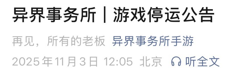 11月3日,《异界事务所》官方发布了停服相关公告,因合约到期以及运营策略方面的调整,该游戏计划在2026年1月8日正式停止运营。对于玩家账号里剩余的充值货币,能够按照一定比例转移到《第七史诗》或者《龙魂旅人》中。