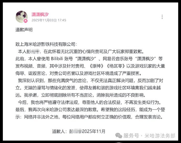 米哈游法务部于11月4日发布公告称,网络博主“潇潇枫汐”涉及的名誉权侵权案已迎来二审终审判决。根据判决结果,该博主需立即删除所有涉案的侵权内容,并且要在相关平台发布道歉声明,此外还需向米哈游赔偿11万元。