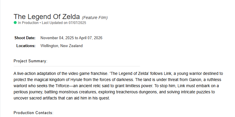 根据影视制作网站ProductionList的最新动态,任天堂与索尼携手打造的《塞尔达传说》真人电影已正式启动拍摄工作。该网站的信息表明,这部影片于2025年11月4日在新西兰惠灵顿开拍,预计拍摄周期将持续到2026年4月7日。尤为值得关注的是,这一时间节点恰好赶上《塞尔达传说》系列问世40周年的纪念时刻。