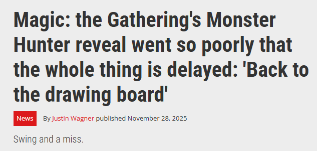 《万智牌》在上周宣布了和《怪物猎人》的联动项目,不过玩家群体很快就出现了大量的批评声音。在面对几乎一边倒的负面反馈后,威世智公司于今日发布消息称,这次联动的“秘典”套牌会延迟到2026年推出,同时还表示会对整个系列展开全面的重新设计。