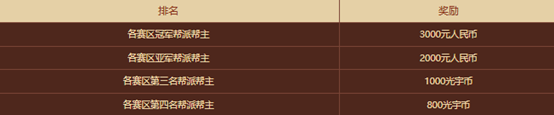 玩家可参与“109”新服首届帮战,除游戏内奖励外,还能额外获取“群雄逐鹿”活动奖励。在该新服首届帮战的任意赛区里,获得第一、第二名帮派的帮主将得到现金奖励,第三、第四名帮派的帮主可获得光宇币奖励。各赛区冠军帮派中,参与过帮战战斗且奖励发放时仍在该帮派的成员,将获得限时60天的“中洲强者”铭牌。