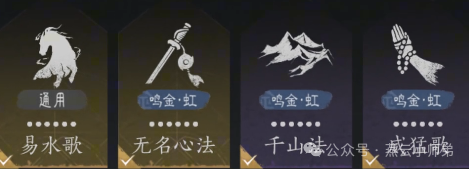 首先要讲的心法搭配这块,目前比较推荐的依旧是之前提到的那四个组合——易水歌、无名心法、千山法和威猛歌。估计这会儿有人会提出,千山法其实可以用断石之构来替换,但这种替换只适合短轴输出的场景,目的是为了提升瞬间爆发能力。