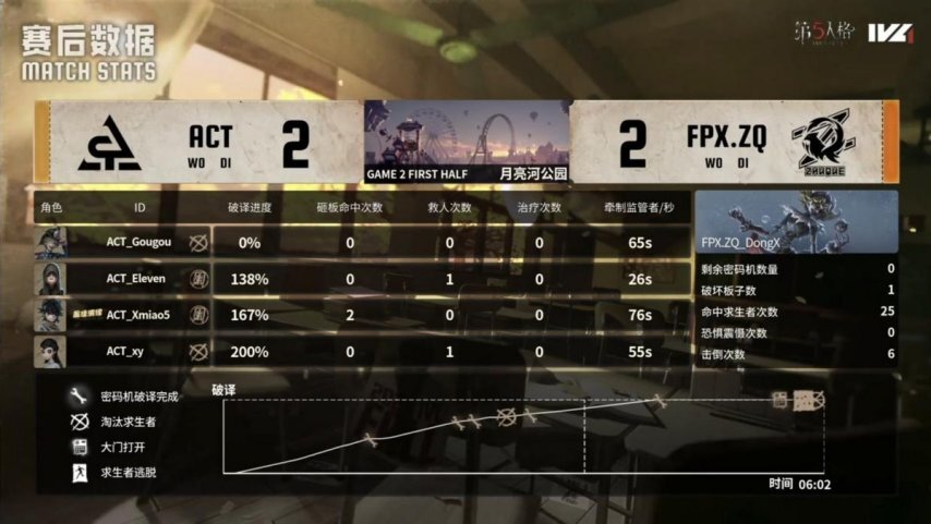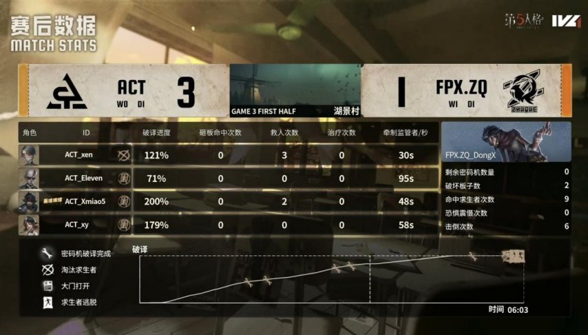 ACT的求生者选择了咒术师、大副、木偶师、魔术师;FPX.ZQ的监管者DongX选择了“跛脚羊”。(BAN先知、幸运儿、机械师、气象学家)