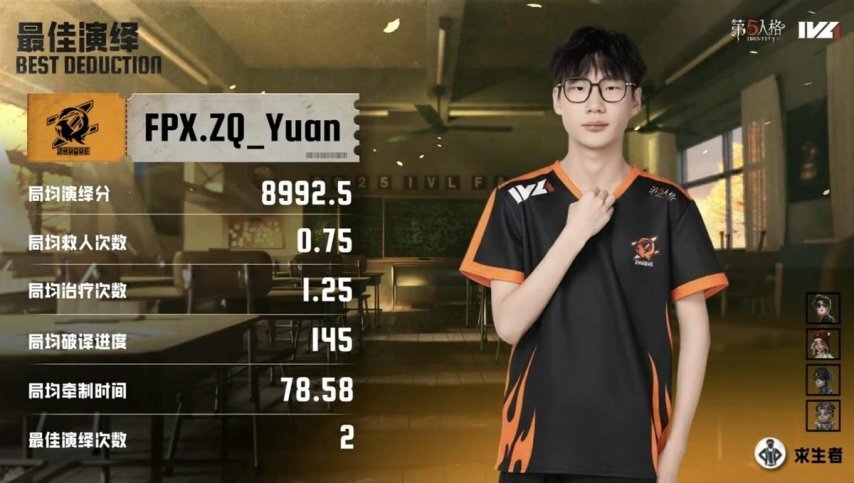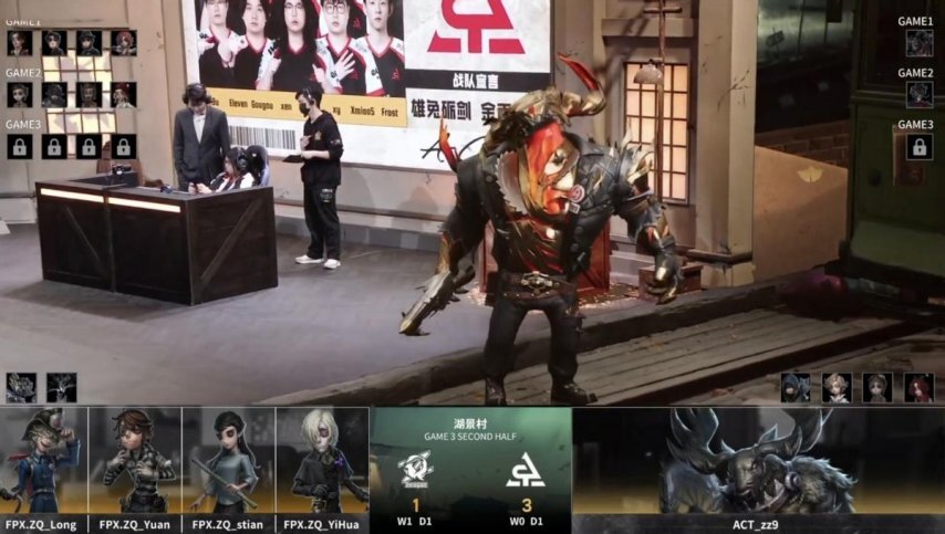 FPX.ZQ的求生者阵容确定为火灾调查员、“囚徒”、古董商与守墓人,禁用角色为“喧嚣”和时空之影;ACT战队监管者选手zz9选用了鹿头,禁用角色包括先知、气象学家、机械师以及哭泣小丑。