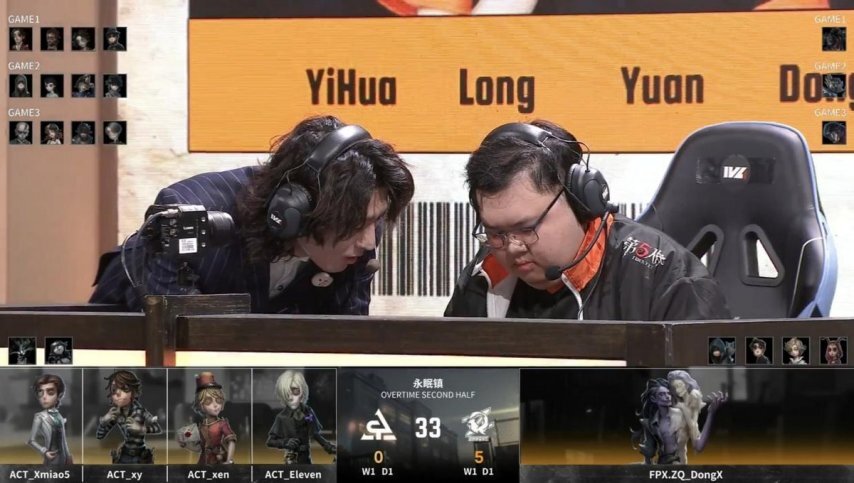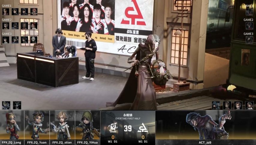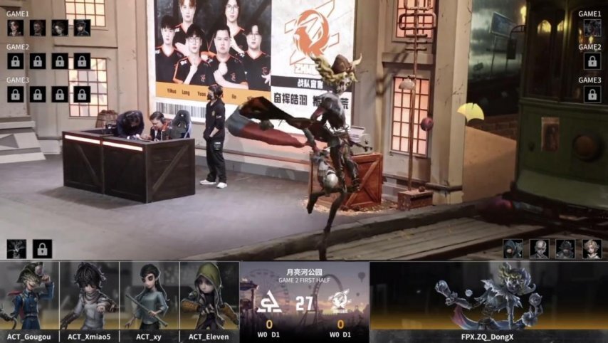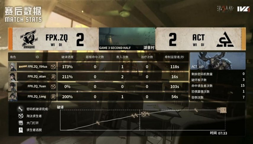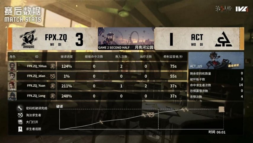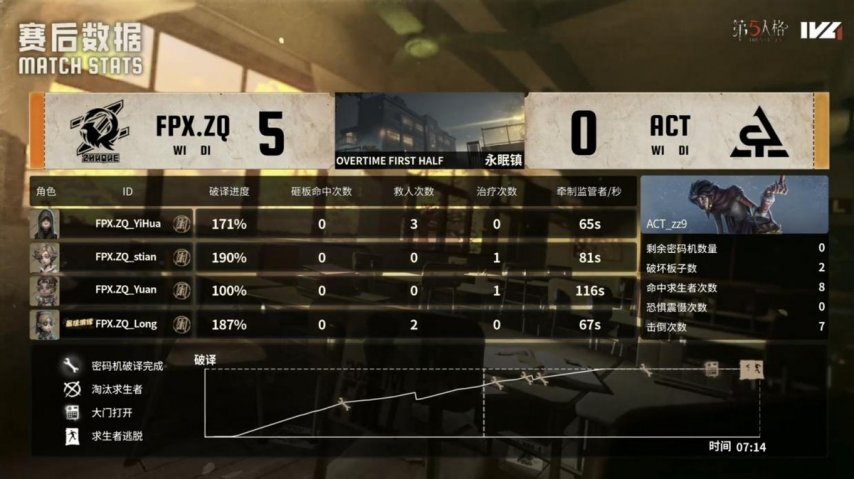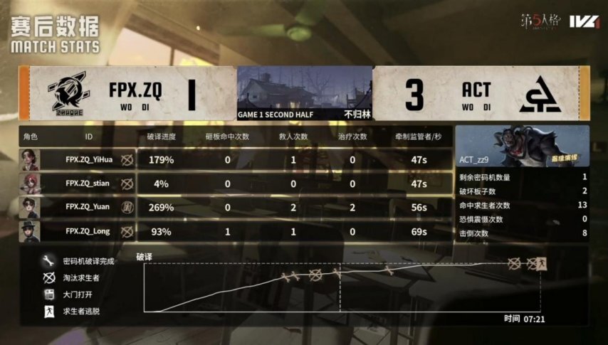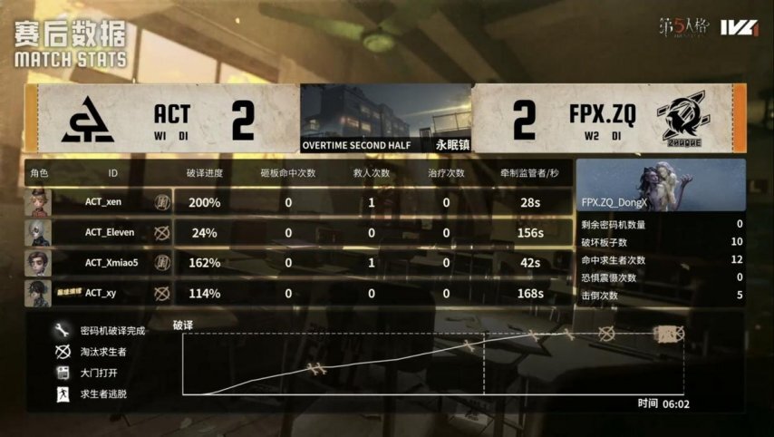 ACT的求生者阵营选用了小说家、守墓人、“囚徒”与邮差,禁用角色为梦之女巫和时空之影;FPX.ZQ战队的监管者选手DongX则选定蜡像师,其禁用列表包含先知、幸运儿、气象学家及祭司。
