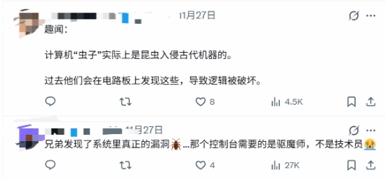 这样的经历在推特上引发了网友们的广泛讨论,除了有人指责机主不讲卫生外,一些程序员还玩起了英语谐音梗——毕竟“BUG”这个词本身也有“虫子”的意思。