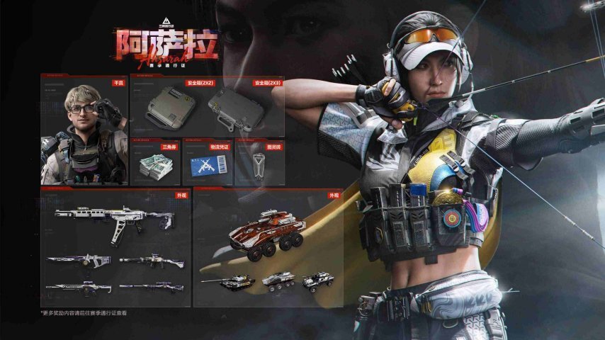 阿萨拉赛季通行证包含【全新工程型干员-比特】(通过免费线即可获取)、【露娜-金牌射手】外观、【SG552突击步枪-运动员】皮肤、【防空车-原木】涂装,以及【安全箱】(免费解锁2*2规格,付费可升级为2*3,该安全箱在当前赛季内持续有效);此外还有大量武器外观、载具外观与战备补给等待玩家领取!