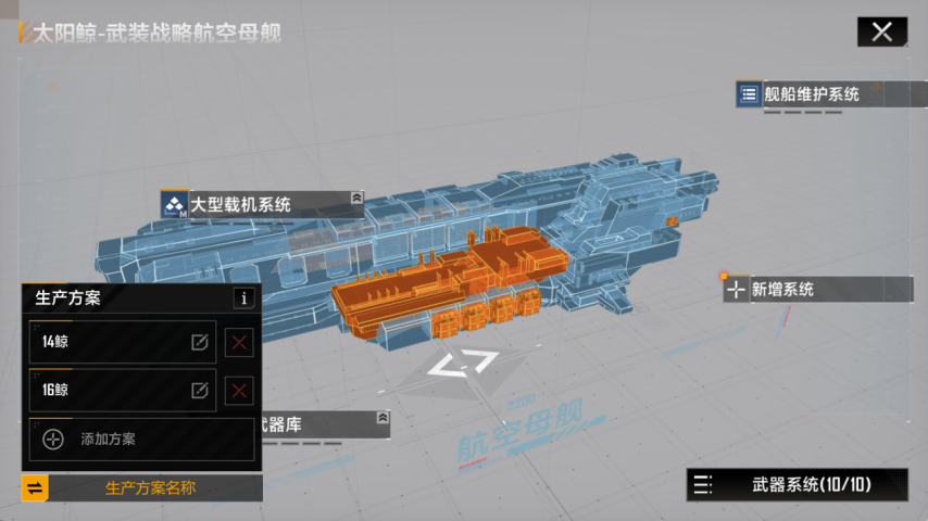 实战应用举例:可以分别制定太阳鲸的两种生产方案,即“13鲸”和“16鲸”,并按此生产3艘“13鲸”与2艘“16鲸”;也能够对FSV830-快速战术支援舰进行定制,配备一艘用于生产战机的支援舰和一艘用于生产护航艇的支援舰。