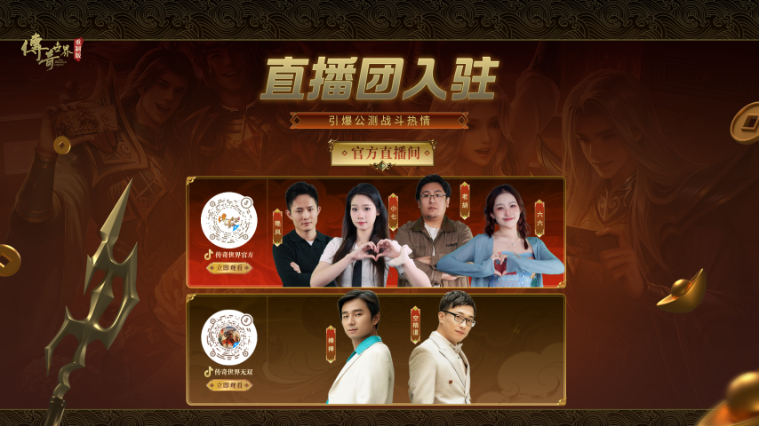 直播盛典期间,晚风、小七、老胡等“传世主播团”成员将在“传奇世界官方”“传奇世界无双”两大抖音官方直播间轮流驻场,传奇四毛、传奇亮哥、芒果冰等头部主播也会同步开启直播,构建矩阵式传播格局,一同见证传世新篇的开启。