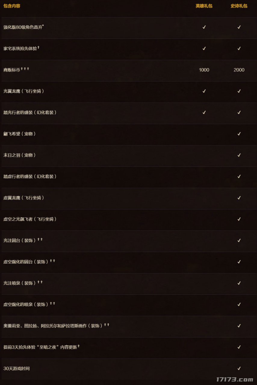 获取踏光行者和踏虚行者幻化套装,光翼和虚翼龙鹰飞行坐骑,末日之羽和翩飞希望龙鹰宠物,额外的商贩标币,以及30天游戏时间。