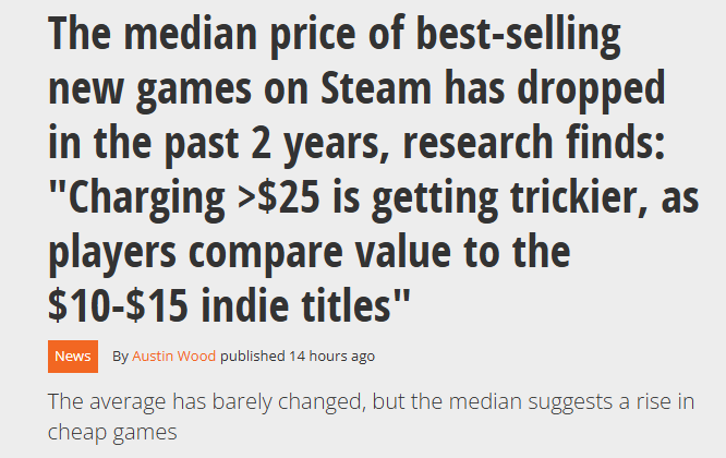 近期,游戏分析机构GameDiscoverCo发布的一项研究验证了不少玩家的直观感受:在Steam平台上,“性价比高”的游戏正以空前的速度占据畅销榜单。相关数据表明,过去两年半以来,Steam平台上畅销新游的“价格中位数”降幅已超过14%。