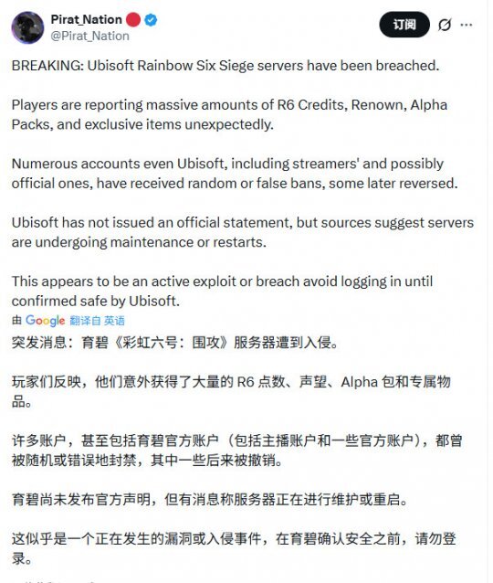 育碧随后通过官方X账号发布说明,明确了当前的处理方向: