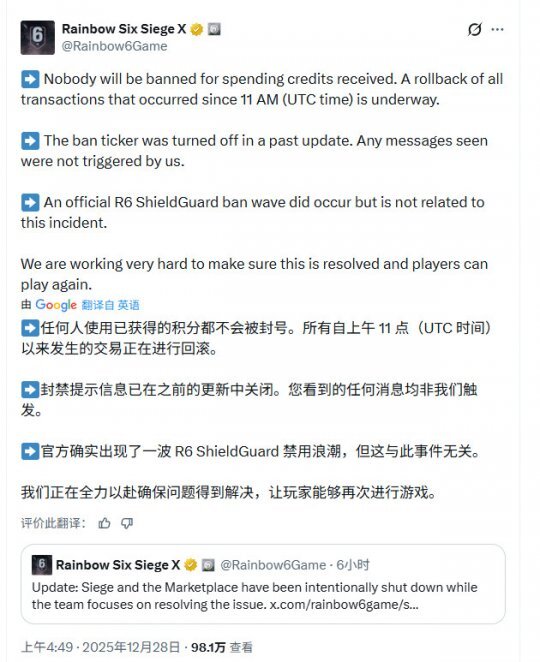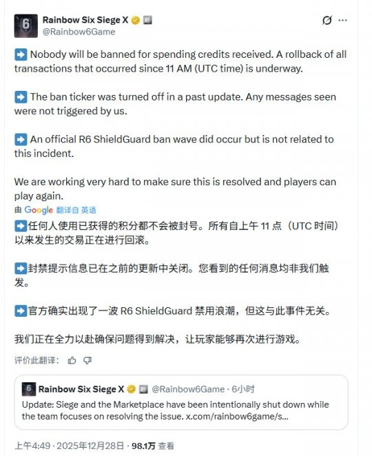 为避免问题进一步扩大,育碧已主动关闭游戏服务器和游戏内商城,让技术团队能够修复系统并执行回档操作。官方称,目前的首要任务是保障玩家后续可以正常、安全地登录游戏。