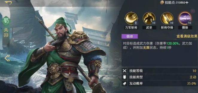 关羽:斩将夺锋+慑峰。核心技能组合,确保无策效果的稳定施加。