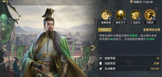 刘备的搭配推荐为丹阳兵,再搭配仁治武功、刮骨疗毒或横江拒马中的一个。丹阳兵能够为队友增加伤害,另外三个技能可以根据实际需要来挑选,比如刮骨疗毒适合用来清除异常状态,横江拒马则可以帮助提高输出能力。