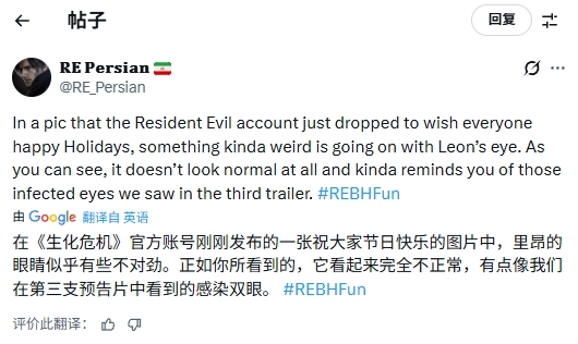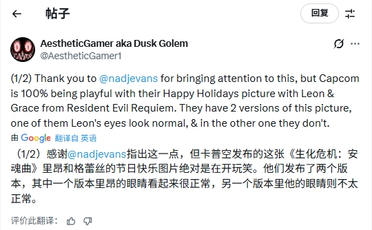 关于此事,《生化危机》的知名爆料者@AestheticGamer1发文称,这张节日祝福图显然是在“玩梗”。官方其实推出了两个版本的图片:一个版本中里昂的眼睛看起来很正常,另一个版本里他的眼睛却显得不太对劲。