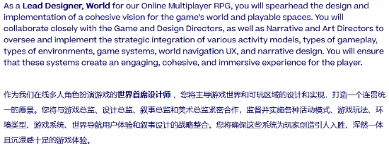 职位介绍部分的内容如下:“担任我们在线多人RPG的世界首席设计师,你需要牵头规划并推动游戏世界与可游玩空间的整体愿景落地……同时要和游戏总监、设计总监、叙事总监及美术总监密切配合,统筹整合并落实包含现有活动模型、玩法类型、环境种类、游戏系统、世界导航体验(UX)以及叙事设计等在内的战略规划。”