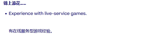 关于任职要求,该岗位期望候选人具备7年以上游戏设计经验,且在此期间至少有3到5年领导或负责大型在线多人游戏空间与系统的经历。岗位明确要求应聘者拥有“管理AAA级质量设计跨职能团队”的经验。在线运营游戏的经验虽不是硬性条件,但属于“加分项”。