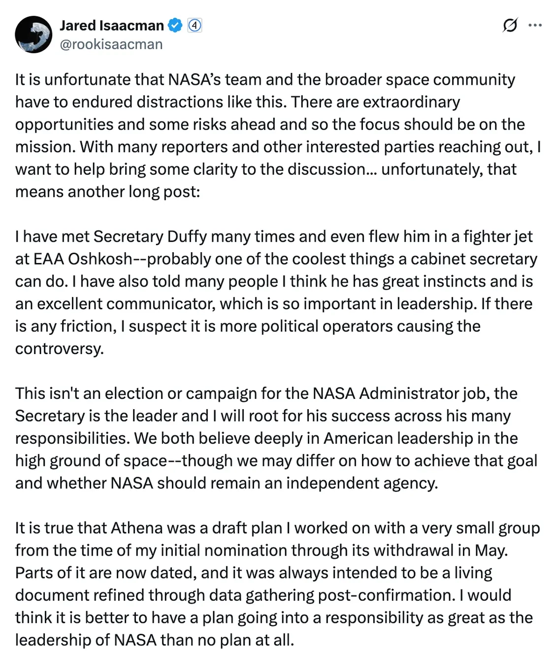这份“雅典娜计划”是由艾萨克曼及其团队在今年早些时候拟定的。那时,艾萨克曼刚刚被特朗普提名出任NASA局长。艾萨克曼还在计划里阐述了杰夫·贝佐斯(Jeff Bezos)旗下的蓝色起源、Rocket Lab、Axiom Space等企业怎样和NASA开展合作,以达成各项既定目标。