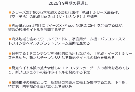 日本Falcom今日公布了截至2025年9月期的决算补充资料,除了亮眼的财务数据外,官方还展望了2026财年的计划,并透露了大量让玩家感到振奋的核心游戏情报。