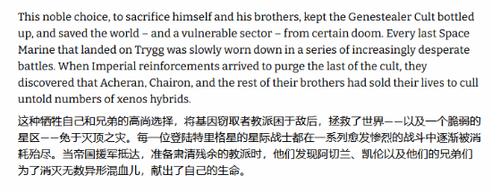 根据官方的说法,他们是在清剿巢都星球特里格上的基因窃取者教派时壮烈牺牲的,等到增援部队抵达现场,他们早已用自己的生命消灭了不计其数的异形。