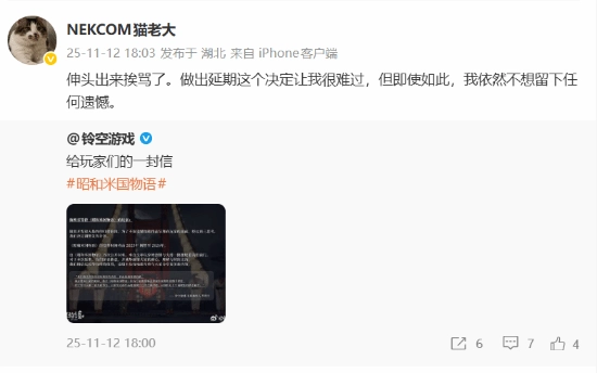 之后,游戏的创意总监兼制作人猫老大转发了这条声明并表示:“我主动站出来接受批评了。做出延期的决定让我心里很不好受,但即便如此,我还是不想留下任何遗憾。”