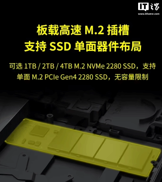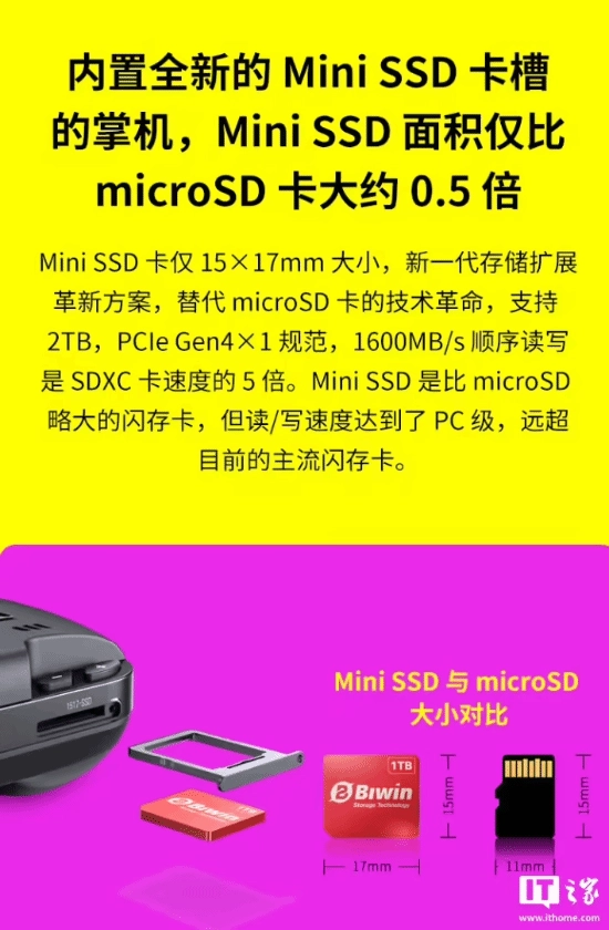 在特色功能上,该掌机配备了2280硬盘插槽,支持插入单面M.2 PCIe Gen4固态硬盘,同时内置Mini SSD插槽,用户可选购佰维的对应产品来拓展存储容量;此外机身还设有MicroSD卡槽,玩家能够在这两种扩容方式中灵活挑选。
