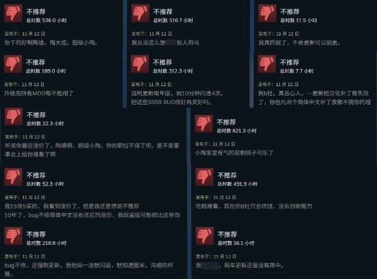 差评的主要原因包括年度版价格上涨、更新后MOD无法使用(存档也损坏了)、简体中文迟迟未补充、闪退问题频繁出现、新DLC由MOD修改而来等方面。