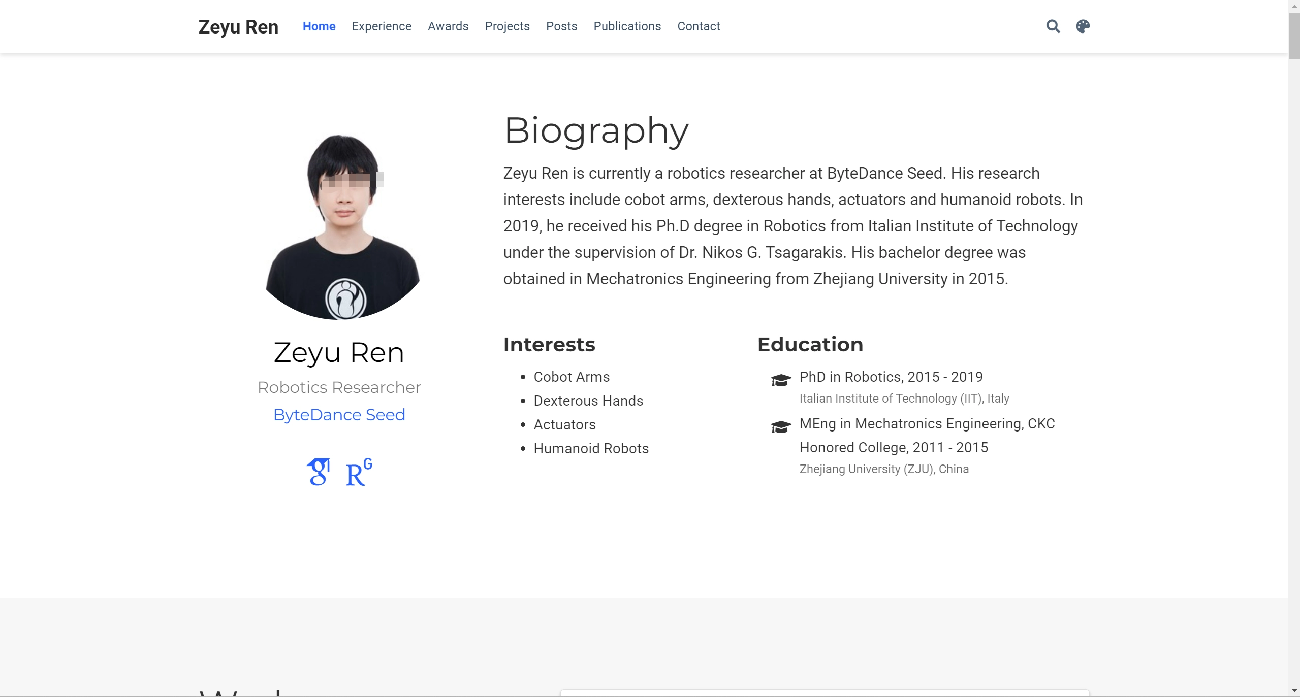 从个人简介中可以得知,他2015年毕业于浙江大学机电工程专业,随后前往意大利理工学院深造,并于2019年顺利获得机器人学博士学位。