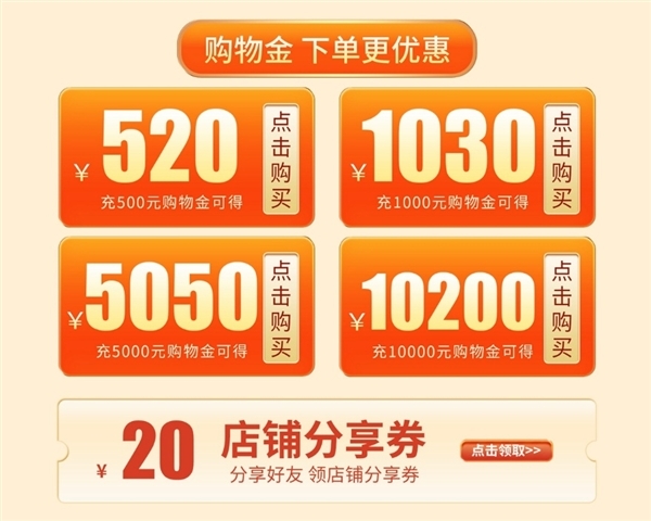 活动进行时,往店铺购物金里充值能享受超划算的价格哦!充500元实际到账520元,充1000元实际到账1030元,充5000元实际到账5050元,要是充10000元的话,还能实际到账10200元呢!除此之外,还有20元的店铺分享券可以用,让你在省钱的基础上再省一笔!